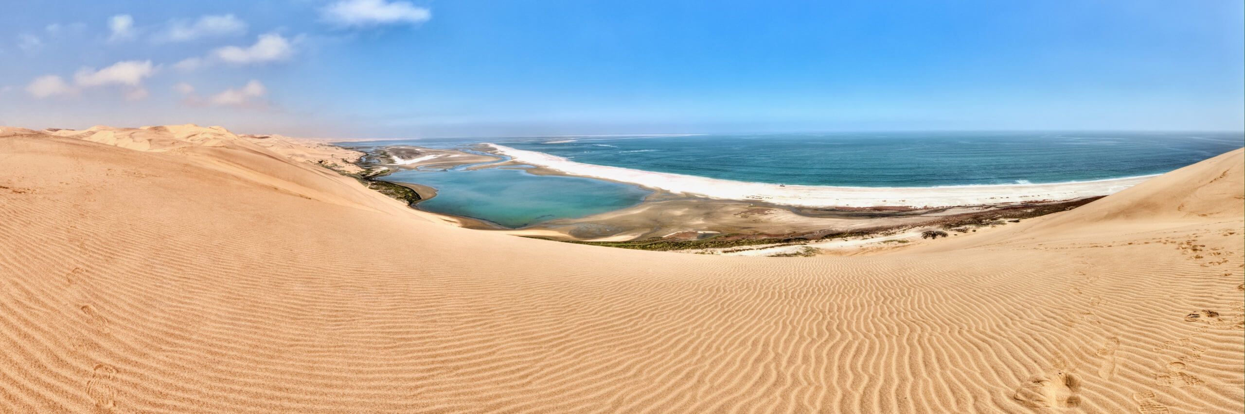 Sandwich Harbour, dat deel uitmaakt van het Namib Naukluft National Park, is een plek waar velen van gehoord hebben, maar die slechts weinigen ooit bezocht hebben. De lagune, de zoutpannen en het vogelreservaat, die samen de Walvis Bay Wetlands vormen, worden terecht beschouwd als de belangrijkste wetlands van zuidelijk Afrika. Reusachtige, steile zandduinen eindigen in de oceaan en vormen zo adembenemende landschappen die erop wachten om door jou ontdekt te worden!
