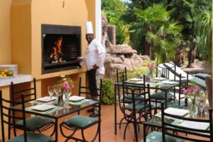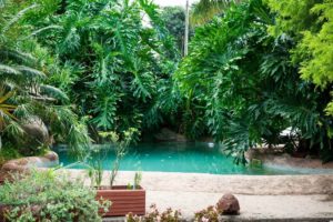 De tuin staat vol met rozen en inheemse planten en je hoort de vogels uitbundig fluiten. Bij het hotel hoort ook een spa met een gym.